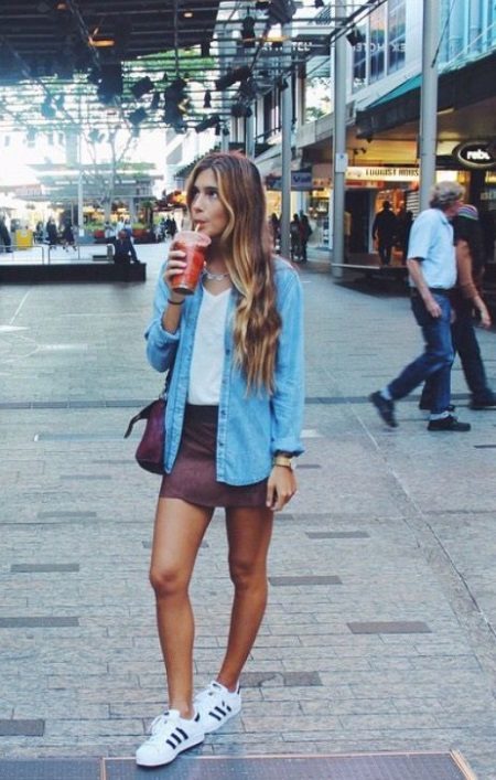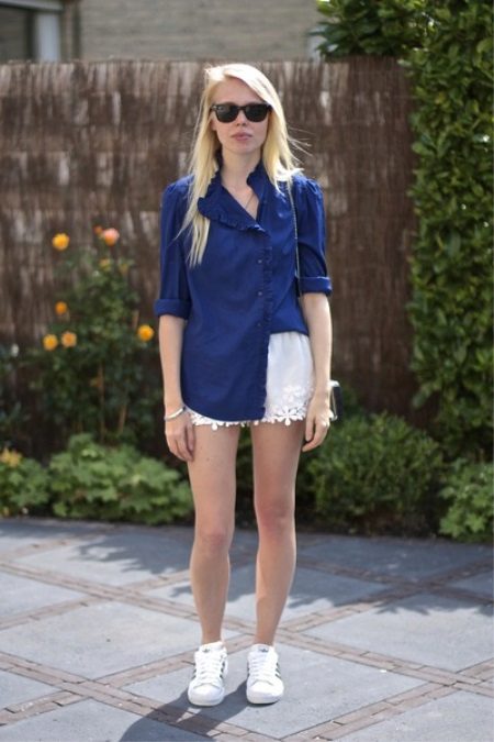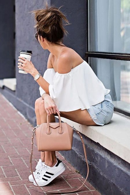 A win-win simple and seductive option is white sneakers, worn with high-rise shorts and a white top.A top can successfully replace a loose shirt or striped knitted blouse.