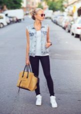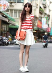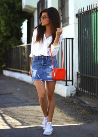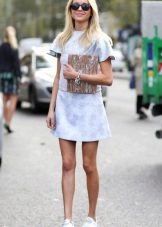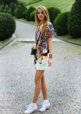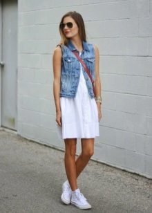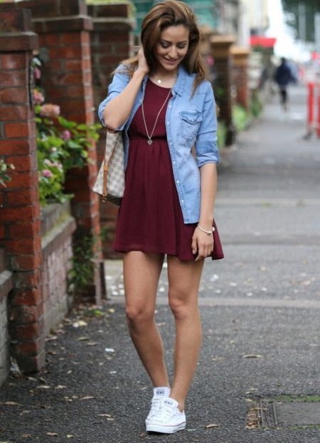 White short sneakers blend perfectly with a vibrant short casual dress. A denim shirt will help to complete the look. For this bow, it is best to choose a light textile bag.
