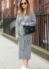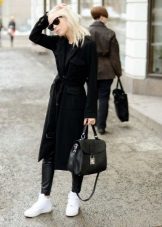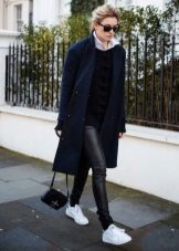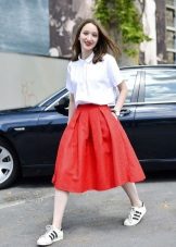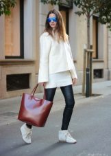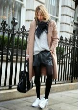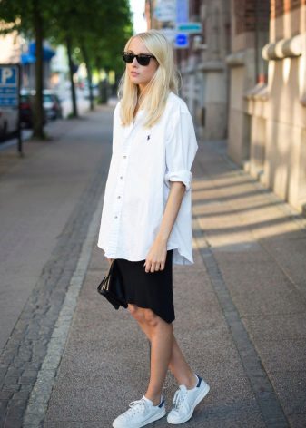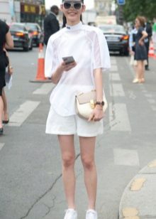 White sneakers can be worn with a skirt. In summer, this can be a mini-length skirt at high waist. White sneakers also fit well with medium-length skirts of different silhouettes. It turns out an elegant and interesting image. At the same time, Moscow fashionistas love to combine white sneakers with black tights. This is a rather extravagant and bold combination, requiring careful attention to the details of the whole image as a whole.