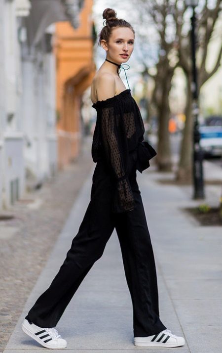 White sneakers are seamlessly combined with the provocative Sport Glam style. Wear white black Adidas sneakers with three black stripes for an elegant black one-piece jumpsuit, consisting of black loose trousers and a translucent top.