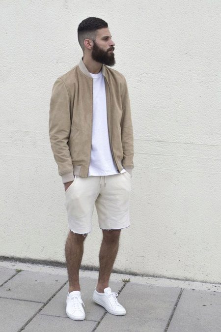 An interesting men's bow can be obtained thanks to the “expensive” combination of white platform sneakers with milk-colored shorts and a snow-white T-shirt. The highlight of the image will be a dark beige windbreaker-bumper.