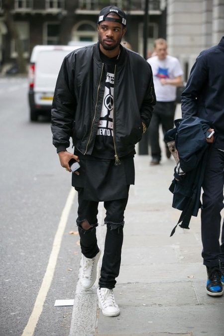 The specific style of hip-hop has long gone beyond its subculture. This style allows the young resident of the metropolis to feel comfortable and relaxed. Black equal jeans, a loose long t-shirt, and a black windbreaker can effectively be combined with white sneakers. The baseball cap with snapback closure completes the look.