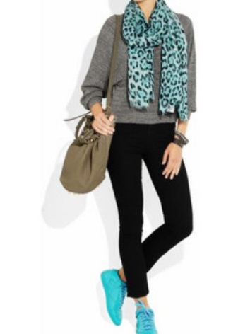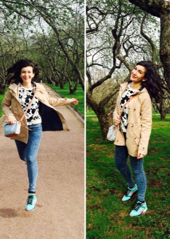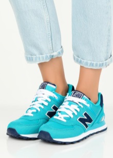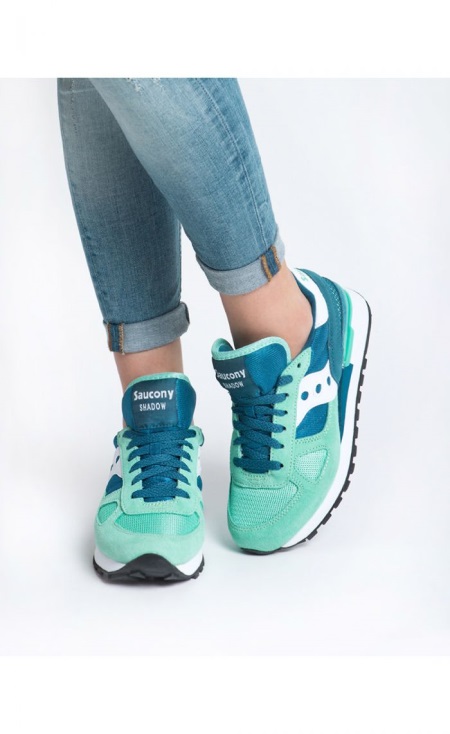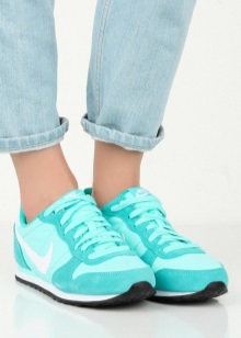 Turquoise sneakers of any models will look great with clothes of shades close to him. Due to the wide variety of variations of this color, you can safely combine turquoise sneakers with blue and green things. This season, sneakers in saturated colors will make up a successful outfit with cropped jeans or shorts. In addition, fashionable jeans of various shades will always look advantageous with turquoise sneakers.