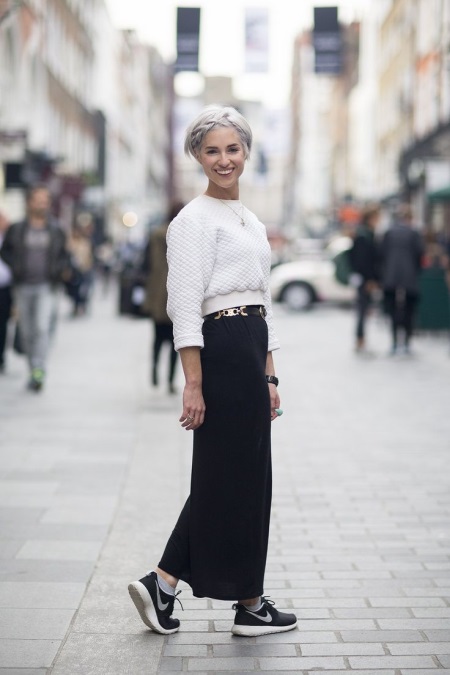 You can safely put on a skirt or dress on the floor with any sneakers - it is comfortable and beautiful.