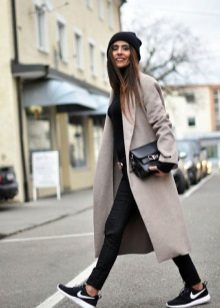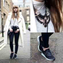 On the streets of big cities you can often meet girls combining sports shoes with a coat. The only thing worth holding on to is a sense of proportion and color schemes. Especially carefully you need to choose a bow if the sneakers are combined with a monochrome bow.