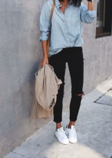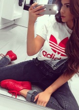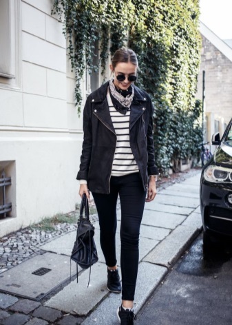 Total Black also does not lose its relevance. Such a bow can be diluted with monochrome red sneakers. The image looks very bright, and you definitely will not be left without attention.