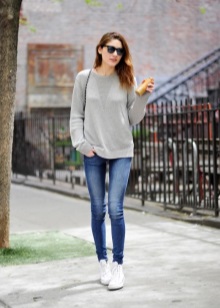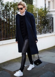 Sneakers are a favorite demi-season model of fashionistas. These sneakers visually lengthen the legs, and at the same time they are very comfortable. Blue sneakers with bright red accents look great with skinny black jeans, a blue coat, and a gray cardigan.