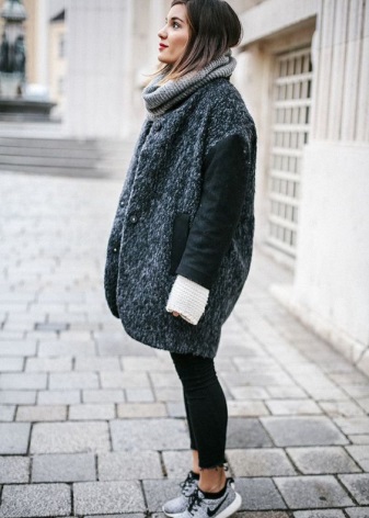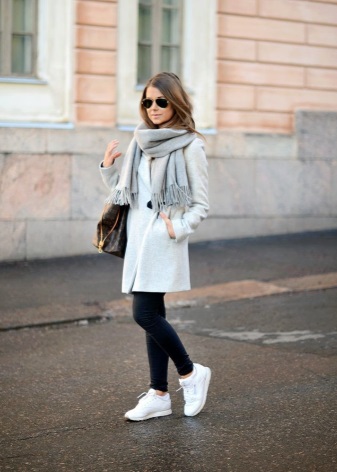 Look very tender with black skini-jeans and a classic coat with a leather insert, complemented by a large-knit purple scarf and white and purple sneakers.