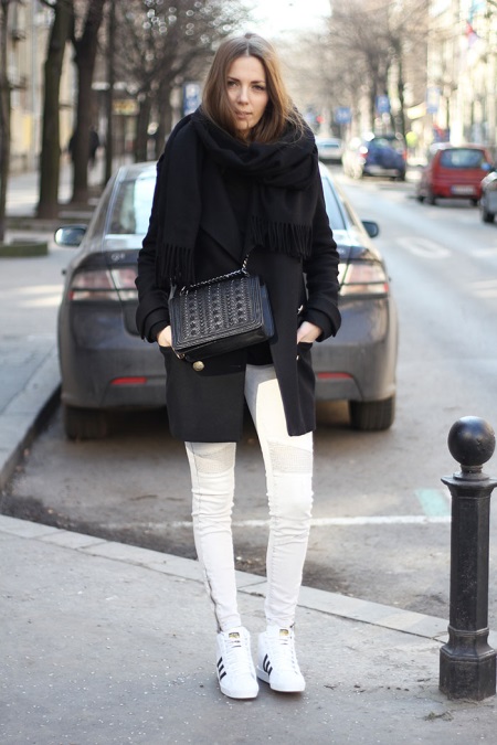 Do you like black and white classics? Then you should take a look at Adidas Original. These sneakers have a thick sole, so they are ideal for spring. And you can complement this model with skinny white jeans, a draped black coat, a large black scarf and a leather black clutch.