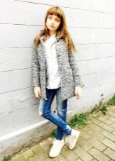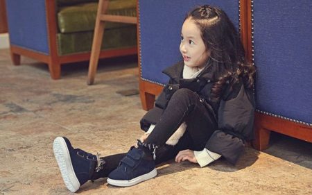 Dark suede sneakers with thick soles work well in dry autumn weather. In combination with a jacket and jeans, it will be warm and comfortable for the child to go for a walk or go to school.