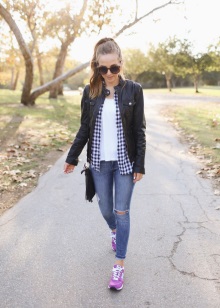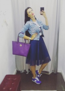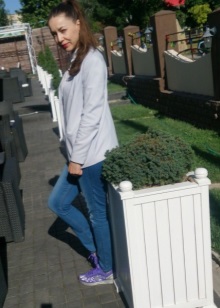 You can play in contrast, you can choose the same purple in tone. Look beautiful with all sorts of T-shirts, hoodies, sweatshirts. On a hot day in the country, in the country, on a trip - a great combination.
