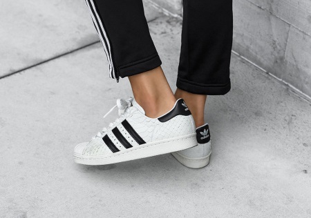 The corporation offers a huge amount of sports shoes and equipment. Women's Superstar sneakers are sold in two colors - black and white. These are great classic shoes made of smooth leather, mesh lining and a rubber sole with a herringbone pattern.