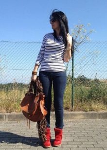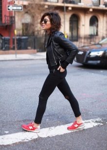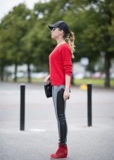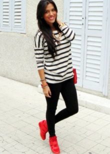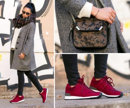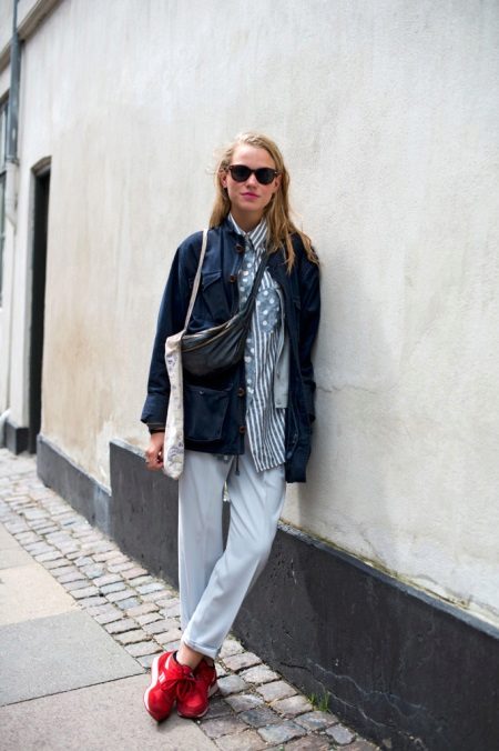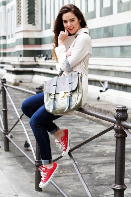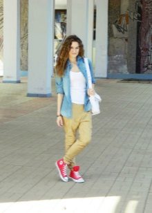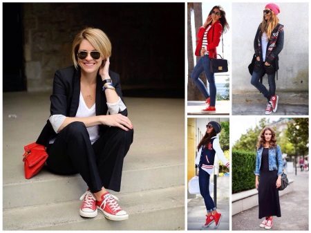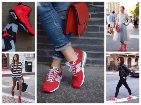 If you wear red sneakers, the clothes should not be red or should be used to a minimum, as it will be too colorful. And this does not mean you have a taste. But some accessory (handbag, glasses, bracelet, belt, beads, cap or baseball cap) may be red.