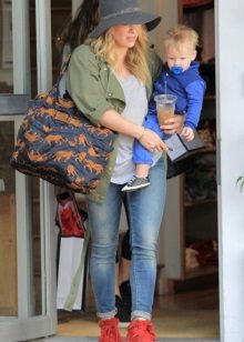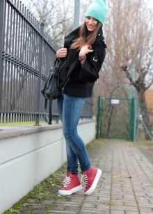 Here is another option for every day. Red crosses on a white sole are the only bright accent in the image. Skinny jeans, a black bag and jacket. The turquoise hat is quite appropriate. She not only completes the picture, but also adds some zest.