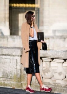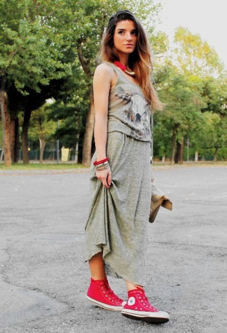 It is definitely not worth wearing red sneakers with an evening gown on the floor. Or with things that are already elegant on their own. For example, tops with iridescent inscriptions. Or things with gold or silver threads in their fabrics.