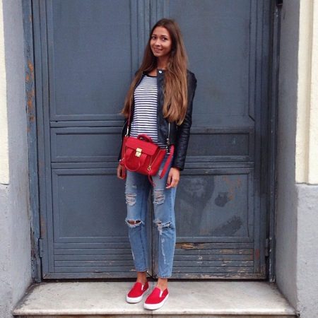 Pay attention to the red sneakers with white soles. Will look great with ripped jeans, a leather jacket and a vest. The red handbag here will be just the way. Look at the photo. This is an image for every day.