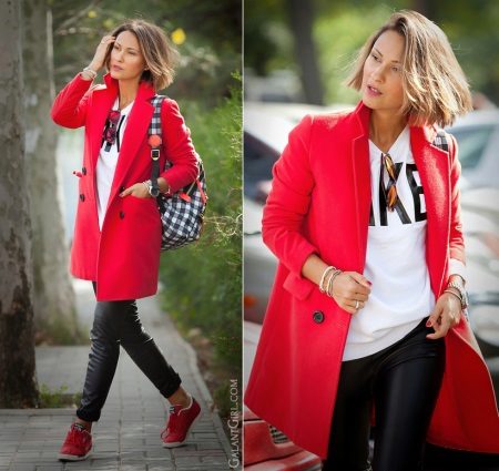Pay attention to the combination of colors in this image. The emphasis is on red sneakers and a raincoat in the same color scheme. The rest of the clothes (black skinny jeans and a voluminous black and white blazer jacket) is just the base, the basis for the manifestation of bright colors. A good look for every day.