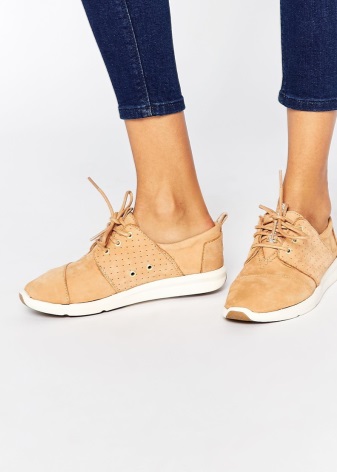Girls can choose a model of sneakers from nubuck in bright colors or with an unusual design. Such shoes will be the main focus of the unique look, so clothing should be presented in calm colors.