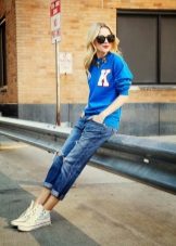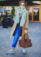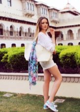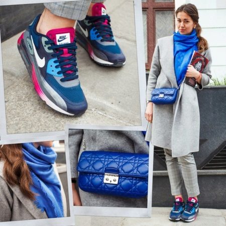 As such details, you can choose a soft stole of bright blue, a small handbag on a long strap and stylish, trendy Nike sneakers, made in blue and pink colors.