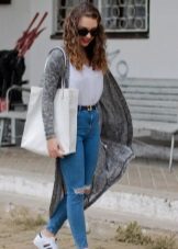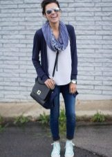 - Urban everyday life can be not only gray and boring, but also bewitching! Combining dark blue skinny jeans with a gray T-shirt, pay more attention to details and complement the outfit with an elongated cashmere coat of a straight cut and a long knit scarf in a dark lilac shade tied around the neck.