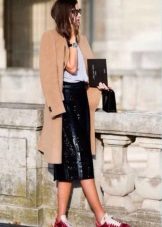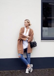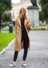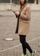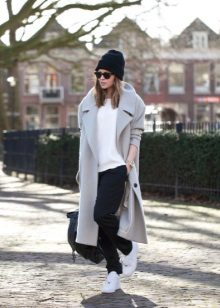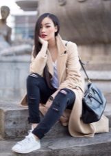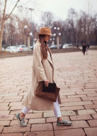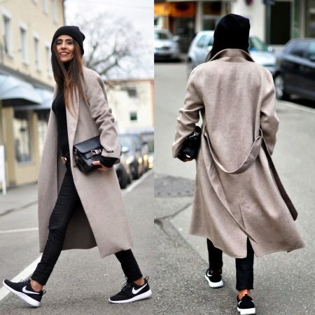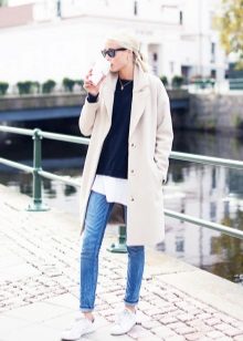 - In the autumn cool it is simply necessary not only to feel warm and comfortable, but also to feel fashionable and stylish. Such an everyday combination of black things, namely a sweater, skinny jeans and a hat, needs a lighter complement, which is a midi-length cashmere coat in a light shade of cappuccino.