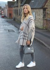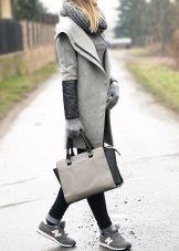 - Each outfit in gray tones needs a bright addition so as not to be boring and dull. That is why straight, light gray checkered trousers, combined with a slim drape coat without a fastener, need vibrant details.