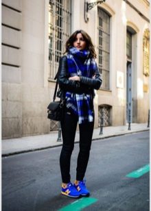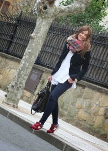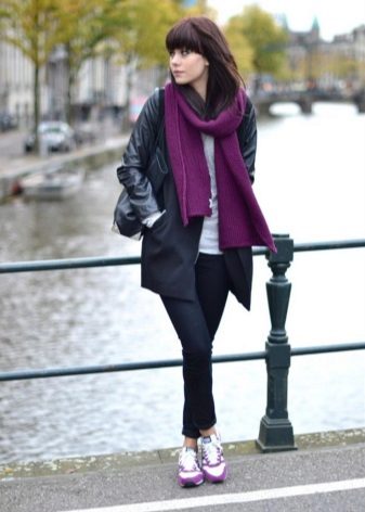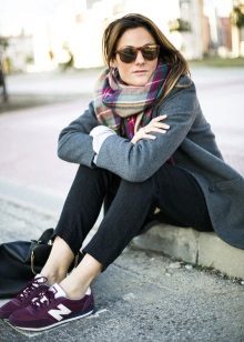 A massive check scarf, a small bag with animal print and bright raspberry sneakers made of natural suede are exactly what you need to make this look more interesting.