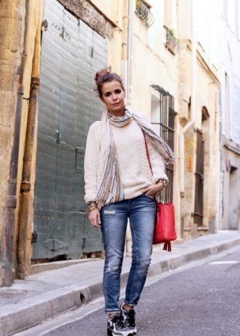 - Another striking example of an autumn outfit, where calm shades are diluted with ripe tones. A gray tweed coat, skinny black jeans, a white sweater are quite calm, albeit very stylish.