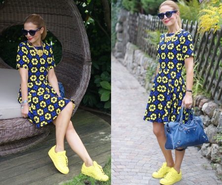 The highlight of the image is that the shoes are bright yellow in perfect harmony with the dress due to the blue and yellow floral print.