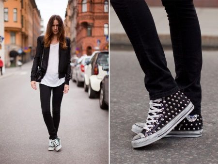 - Look very stylish sneakers with studded elements. The product is in demand among supporters of an informal style, but lovers of adding “spiciness” to everyday life will also not remain indifferent.