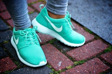 Light green Nike sneakers look great on young fashionistas. These sports shoes are suitable for daily morning jogging in warm weather or for fitness in the gym.