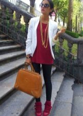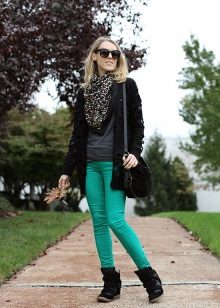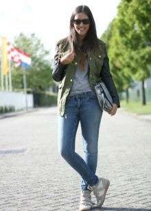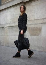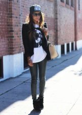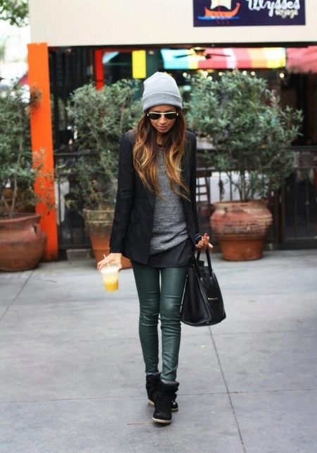 - Another example of a universal casual look consists of skinny jeans, an elongated jacket and tunic combined with black arrowroots. The black jacket and black sneakers on the platform do not coincide in color - this way the color combination is balanced, the gray tunic with the transition to dark gray also contribute to the “color” balance. Effectively complement the image of a knitted hat-stocking of gray color, a tone lighter than the tunic, in the cool off-season. The bag is suitable volumetric, black or a few tones lighter. You can complement the image with dark glasses in a fashionable round frame.