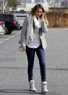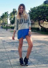 Sneakers on the platform can be combined with many things: sweatshirts, jeans, T-shirts, leggings, short jackets, cardigans, tunics, leggings, dresses and denim skirts.