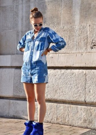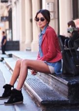 - White and blue sports arrowroppers go well with short denim shorts. The platform visually lengthens the legs, short shorts “support” in this visual effect. A denim shirt with a combination of light and dark colors harmoniously complements the look. A brown leather belt is emphasized by a denim tandem. This image is suitable for everyday life, walking around the city, for relaxing.