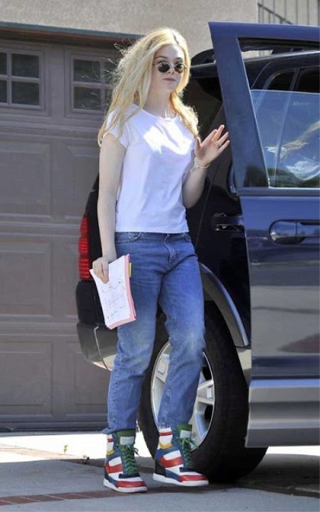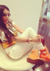 - A versatile combination of narrow, straight jeans in light color and a simple white tank top with platform sneakers. A simple top “brightens up” the brightness and multi-color of the sneakers. A hidden platform adds growth, the height of the sneakers allows you to wear them in bad weather. High lacing, contrasting colored stripes attract attention and make these shoes the main emphasis in the image.