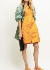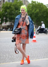 Option for romantic girls: a light chiffon dress with a small floral print + orange sneakers on a flat sole + denim jacket.