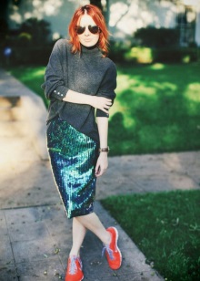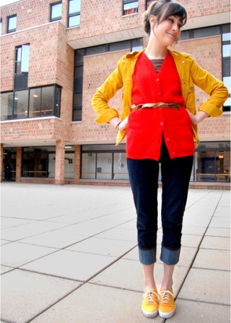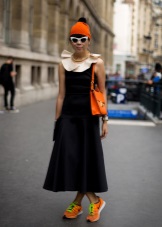 Option for extravagant fashionistas: laconic cardigan + layered skirt of light tulle + acid-orange sneakers. More recently, such a combination would be considered bad taste, and today it is one of the most stylish and relevant images.