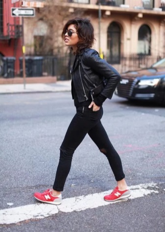 Another fashionable combination: black leather pants, a white T-shirt or top and orange sneakers. The image can complement a leather jacket.
