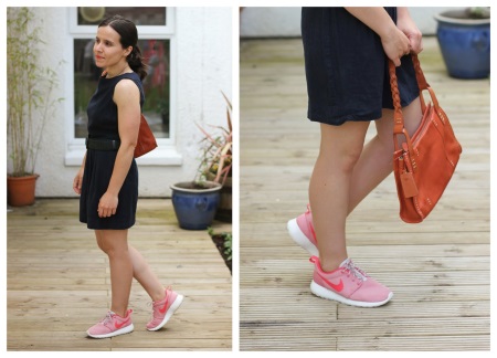 Sneakers in a soft orange hue perfectly accentuate the fitted steel, black, or green knit dress.
