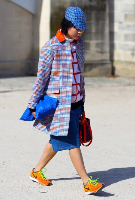 Orange sneakers look very organic with different denim items. It can be a denim dress or shorts with a top or a t-shirt.