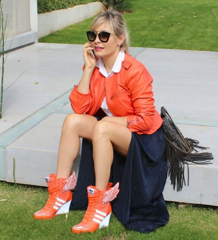 Fashionistas and lovers of bright, catchy images will surely appreciate the bright orange sneakers on a high platform or sneakers. These models are characterized by a high upper part, some bulkiness and a light, rubberized sole, which gives the sneakers almost complete noiselessness when walking.