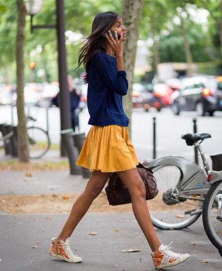 As for skirts, flared or straight models made of dense material, sports skirts and even floor skirts with a high slit can be worn with such sneakers.