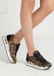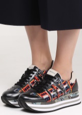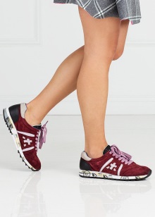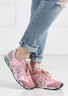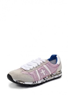 Sneakers Premiata Lucky-D. The initial cost reached 17,500 rubles. Today in the online store it can be purchased for 12 thousand. This female model in pink with a print on a compacted sole is made of natural suede with leather and textile inserts. The sole made of high-quality rubber has a thickness of 1.5 cm and the height of the “heel” is 3 cm. On the side is the company logo of the manufacturer.