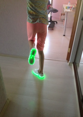 A feature of the luminous sole is the presence in it of a special LED-tape or other flexible elastic materials that respond to pressure on the shoe. The result of this reaction is the highlight of the entire perimeter of the shoe or part of it.
