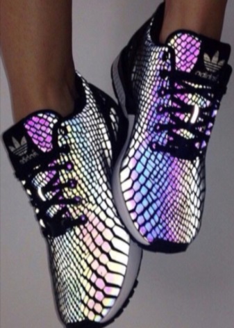 Reflective inserts are made of pieces of special reflective material, which at different angles of light can differently shimmer and even create glare. Sometimes a reflective is created by applying a special coating to the normal surface of the shoe. Modern gurus for running sports shoes: Nike, Adidas, Puma, Aisics, and Jordan, all have reflective collections. In them you can see sports and casual shoes, reflecting white color, as well as a whole palette of colors.