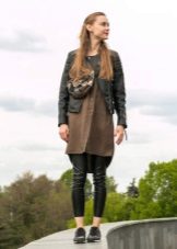 A gray knitted dress with a knee-length fitting body. Interesting looks can be obtained with a noodle dress, with a dress with a long sleeve. A leather jacket will complement this look.