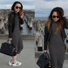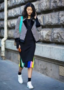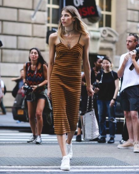 We suggest you be inspired by a large selection of fashionable images from lookbook bloggers. Here you can see both classic calm combinations of sneakers with dresses, as well as avant-garde bows designed to stand out from the crowd and attract attention.
