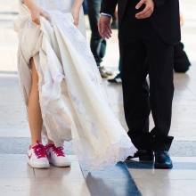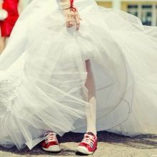 Most often, brides prefer either bright sneakers or laconic white sneakers. Photographers always emphasize sneakers during photo shoots, capturing the cheerful mood of the newlyweds. After all, the bride’s mood in sneakers is preserved for the whole solemn day, and the evening does not overshadow the heaviness in the legs from uncomfortable shoes. Here are a few examples of well-chosen wedding sneakers.