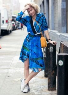 Dress mini and voluminous bright sneakers sneakers.If you choose sneakers on a platform sole, then it is visually the extender of your legs. A large bag-bag will complement this image and balance voluminous sneakers.