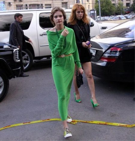 Another celebrity who ventured into a fashion experiment with shoes, Natalia Vodianova. A green flowing dress and green sneakers attracted special attention to her at the Silver Galosh Award.